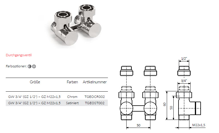 Produktinformationen "Absperrdurchgangsventil 50mm SC; GW 3/4" (GZ 1/2")-GZ M22x1,5; Chrom"